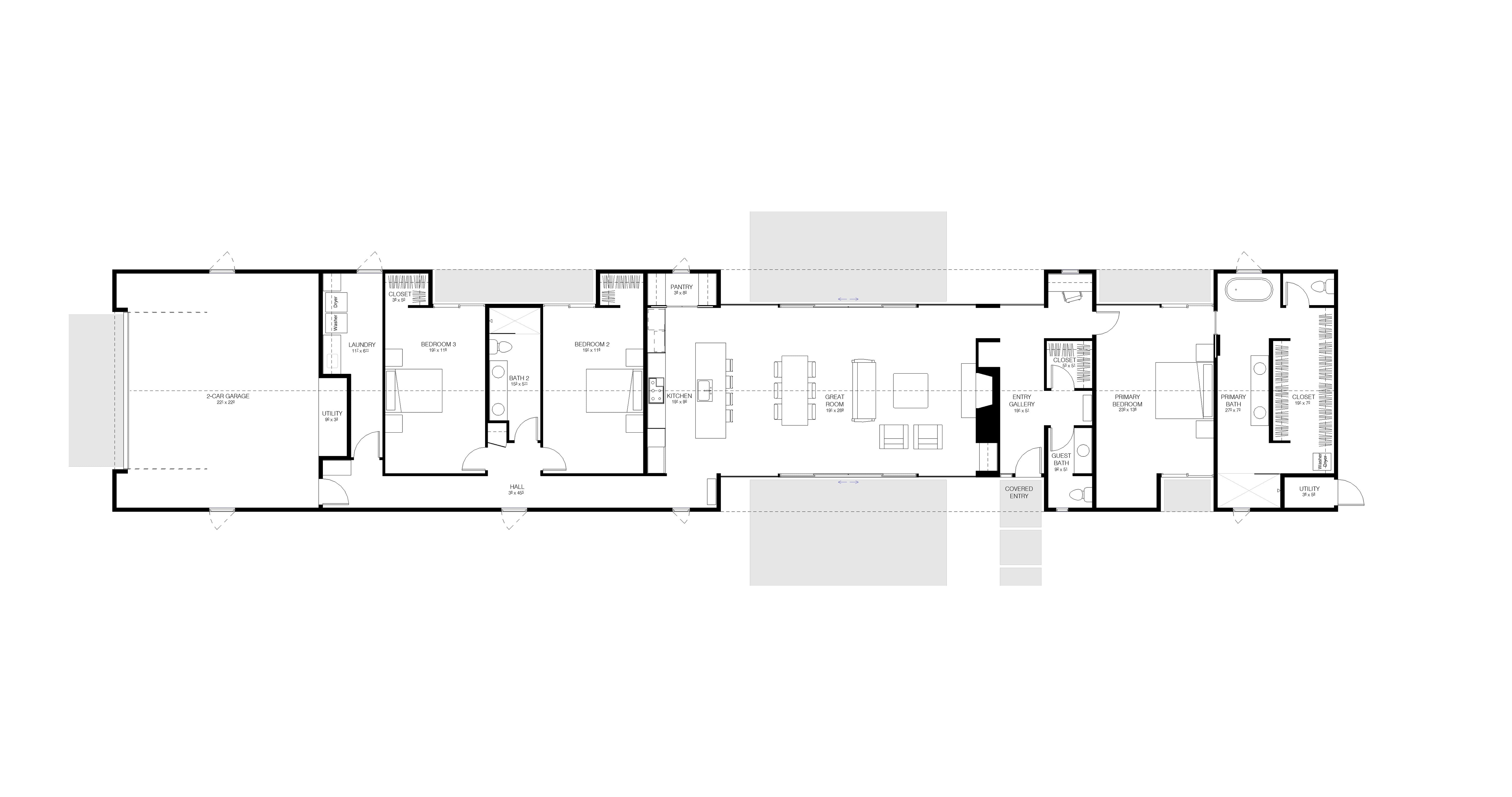 The long, narrow layout promotes natural cross-ventilation and enhances connection to the outdoors, featuring a stunning glass-walled great room that bathes the interior in natural light. With a classic gabled roof and refined modern details, this home is far from ordinary, exuding a sophisticated charm.